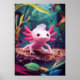 Lassen Sie sich in eine ruhige Unterwasserwelt entführen, in der sich das ruhige Acholotl mit featherischen Kiemen auf einer felsigen Oberfläche stehend, mit großen, dunklen Augen, die nach vorn blicken. Die Kreatur wird im Karikaturenstil mit einer weichen, fast flauschigen Textur gerendert. Im Hintergrund herrscht eine lebhafte Unterwasserszene mit grünem und blauem Blattwerk, Blasen und Steinen, die die farbenfrohe Unterwasserdekoration unterstreichen.