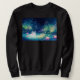 Ein weißer Axolotl mit flauschigen rosafarbenen Ohren wird auf einem Teich, umgeben von blühenden Lilien und lebendigem Laub, ruhig schwebend gesehen. Die Kulisse bietet einen Nachthimmel voller abstrakter, leuchtender Plantagen, die eine bezaubernde, traumhafte Atmosphäre schaffen.