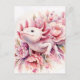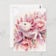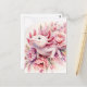 Auf dieser Postkarte befindet sich ein zauberhafter, hellrosa axolotaler Salamander unter Blume in einem weiblichen Blumenportrait. Der axolotl hat einen sanften, skurrilen Ausdruck, mit seinen charakteristischen äußeren Kiemen in einem lebhaften Rosa, das mit der gesamten Palette harmoniert. Es ist von üppigen, blühenden Blume in Rosa und Pfirsichtönen umgeben, mit zarten Blätter und botanischen Elementen, die die Komposition ergänzen. Das weiche und verträumte Farbschema, kombiniert mit der detaillierten Darstellung der axolotl und floralen Elemente, schafft ein charmantes und ruhiges Bild.