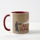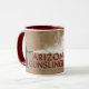 Eine Tasse für die Pistolenhelder von Arizona-Pistolenheldern mit einem Logo des rauchenden Gewehrs auf einem ledernen Hintergrund. Stellen Sie eine Tasse mit Ihrem eigenen alias her.
