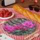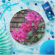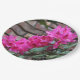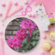 Hübsche, rosa Azalea Blume und grüne Blätter in der Nähe des Kamins aus rotem Ziegelstein. Original Fotografie von TamiraZDesign.