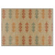 Azteken, ein amerikanisches Stammesdesign mit geometrischen Mustern in Blau- und Orangetönen auf einem wüstenartigen Sandboden.
