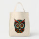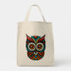 Die dekorative Eule ist handgefertigt und mit Azteken-Mustern in Schwarz, Rot, Türkis und Orange gestaltet.