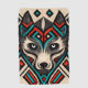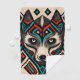 Das ist ein handgefertigtes, dekoratives Wolfsgesicht mit Azteken-Mustern in den Farben Schwarz, Rot, Türkis und Beige.