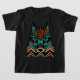 Das ist ein handgefertigtes, dekoratives Wolfsgesicht mit Azteken-Mustern in den Farben Schwarz, Rot, Türkis und Beige.