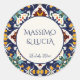 Azulejo blau Portugiesisch Mittelmeer Marokko verzierte Fliesen Muster Hochzeitskleber Vorlage Braut und Bräutigam Namen Aufkleber Umschlag Aufkleber