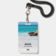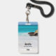 Nennen Sie Abzeichen mit einem schönen Foto. Ein weißer Sandstrand mit einer sanften Brandung. Das türkisblaue Wasser umgibt einen zackigen Felsen.