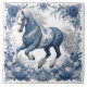 Diese Keramik-Kachel ist mit einem Azurblau gesteppt und wird in einer dynamischen Pose vor einer knackigen weißen Kulisse gefangen. Intrikate Blumenmuster schmücken den Körper des Pferdes, fließende Mähne und Schwanz, sowie seinen dekorativen Sattel oder Gurtband. Der Künstler betont subtil die Muskeln und Bewegungen des Tieres. Eine detaillierte Blumengrenze in derselben tiefblauen Farbe umrahmt die Szene. Die symmetrische Zusammensetzung und die leicht erhöhte Perspektive heben die Haltung des Pferdes hervor. Die Farbschattierungen und die gestreute Beleuchtung sorgen für eine Vintage Atmosphäre, die an klassische Fliesenkunst erinnert. Dieses liebevoll gemachte Design erinnert an klassische Schönheit und Kunst.