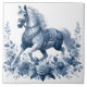 Ein azures Steed, gefangen in der Mitte, verkörpert Blumengnade auf dieser Keramik. Intrikate Blumenmuster, die an zarte Blüten erinnern, fließen durch den Körper des Pferdes, fließende Mähne und Schwanz, bis hin zu seinem dekorativen Sattel oder seinem Schmuckstück. Der Künstler stellt geschickt die kraftvollen Muskeln und die Bewegung der Flüssigkeit des Tieres dar. Ein Rahmen von detaillierten Blumendesigns in derselben tiefblauen Farbe umrahmt das Bild. Die ausgewogene Zusammensetzung und eine leicht erhöhte Perspektive unterstreichen die dynamische Haltung des Pferdes. Farblich und sanft beleuchtet, schaffen eine Vintage und ruhige Atmosphäre, die sich durch klassische Kachelkunst auszeichnet. Dieses sorgfältig gestaltete Design strahlt klassische Schönheit und Kunst aus.