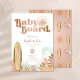 Baby an Bord, Baby Dusche Einladung ist die perfekte Babydusche für Ihre surfbezogene Babydusche. Die ockerfarbene Holzsurfwand, die Muscheln und die in Beige und Braun gehaltenen Palmen sind perfekt für eine geschlechtsneutrale Babydusche.