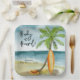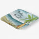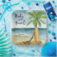 Baby an Bord! Baby Dusche Einladung - perfekt für eine Sommerdusche. Thema Strand. Das Aquarelldesign besticht durch eine Ozean- und Strandlandschaft mit Surfbrett, Palmen und Sommerhut.