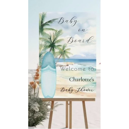 Ein Begrüßungszeichen für eine Babydusche, die einen kleinen Jungen feiert. Ein Strand mit feinem Sand, Meereswellen und Palmen als Hintergrund und ein blaues Surfbrett am Strand.
