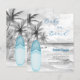 Eine Retro-Einladung für eine Babydusche, die einen kleinen Jungen feiert. Ein schwarz-weißer Sandstrand in Aquarelltönen, Meereswellen und Palmen als Hintergrund und ein blaues Surfbrett am Strand. 1 Blatt = 1 Einladung mit Druckkante bis Kante.