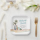 Niedliche Babydusche-Teller zum Thema Surfen, die eine Aquarellbilder einer tropischen Strandlandschaft mit Palmen, Sandstränden, Seestern und Surfbrettern zeigen, und "Baby an Bord" in einem lustigen Retro-Blau-Drehbuch gezeigt. Fügen Sie den Namen der Mutter und das Baby Duschdatum in einfacher Schrift hinzu.