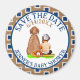 Braune und blaue personalisierte Save the Date Taste mit einem kleinen Jungen, der neben einem Hund mit Baseballmotiv sitzt.