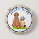 Braune und blaue personalisierte Jungentante zum Knopf mit einem kleinen Jungen, der neben einem Hund mit Baseballmotiv sitzt.