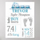 Baby Birth Stats Unterschreiben mit blauem Zug und Fußabdruck. Fügen Sie einfach alle Geburtsinformationen des Babys hinzu. Geschlechterneutral.