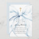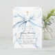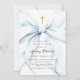 Minimale Taufeinladung mit einem eleganten blauen Bogen und einem goldenen Kreuz.