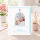 Weißer Hintergrund mit einem blauen Rahmen und einem goldenen Kreuz Persönlich gestalten und ein Foto mit Details hinzufügen. Blauer Text. Bogenförmiger Rahmen aus Foto 1 Blatt = 1 Einladung mit Druckkante bis Kante.