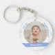Trendy, personalisierter, neuer Baby-Boy-Schlüsselanhänger mit einem weißen Rahmen mit einer runden Öffnung für ein maßgeschneidertes horizontales Foto, und einer gekrümmten blauen Band auf jeder Seite, die den Namen oder Namen und das Geburtsdatum des kleinen Jungen in einem eleganten Drehbuch Schriftart / Typografie erscheint. Beachten Sie, dass Sie wählen können, um diesen Schlüsselanhänger Single-seitig zu kaufen. Dieses Design enthält die Worte "Ich Liebe dich, Oma Johanna!", die du personalisieren oder löschen kannst. Es umfasst auch einen Kreis von weißen und silbernen Schneeflocken und Sternen.