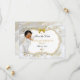 Ein wunderschöner Baby in seinem taufenden Anzug mit goldener Kreuzung und goldenem Kreuz. Hintergrund ist weißes Satin, goldenes filigranes, goldfarbenes und silberes Glitzer und Bugverzierung. Die Rückseite ist mit goldenen Blume auf weißem Satin-Hintergrund geschmückt.