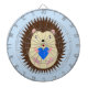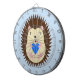 Dieses tolle Dartboard zeigt ein Digitalkunstbild eines süßen braunen stacheligen Babyjungen Igels mit braunen Augenlidern und einem großen Lächeln, der ein blaues Herz hält. Ein großartiges Design, um die Geburt eines Babyjungen zu feiern.