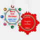 Frohe Erste Weihnachten in Schneekoppel roten Typografie vor weißem Hintergrund geschrieben. Baby Boy NAME geschrieben in hellblauem Text. Die Rückseite ist in roter Farbe mit Text in weißer Liebe, Oma & Opa JAHR (personalisieren mit beliebigen Namen). Schaut von festlichen Schneeflocken farbenfrohe Lichter Ornamente in rot, grün, blau, orange, gelb, rosa an der Außengrenze. Innen doppelte Ringe in festlichem Grün und Rot mit kleineren geometrischen Kreisen in Silber und Gold in Himmelblau umrissen. Original Artwork Design von TamiraZDesign.