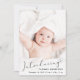 Eine moderne Karte, um die Geburt Ihres Babys anzukündigen, mit seinem Foto überlagert mit "Introducing" in einem stilvollen Drehbuch mit einem Herzschlag. Fügen Sie unten seinen Namen, das Geburtsdatum und die Geburtsdaten hinzu. Auf der Rückseite, fügen Sie drei zusätzliche Bilder und personalisierte Nachricht auf einem pastellblauen Hintergrund.