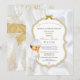 Ein wunderschöner kleiner Junge in seinem taufenden Anzug und goldener Kreuzhalskette. Der einladende Hintergrund ist weißes Satin mit goldfarbenem und silberfarbenem Glitzer und Bugverzierung. Die Rückseite ist mit goldenem Blume-Muster und Goldband auf weißem Satin-Hintergrund geschmückt.