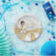 Wunderschöner Anzug auf weißem Satin-Hintergrund mit Goldband.