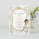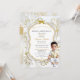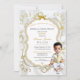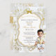 Baby Junge in weiß & gold Anzug. Der Hintergrund für die Einladung ist weißes Satin, goldenes filigranes, goldfarbenes und silbernes Glitzer und Bugverzierung. Die Rückseite ist mit goldenem Blume-Muster und Goldband auf weißem Satin-Hintergrund geschmückt.