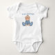Ein Baby Junge in einem blauen Deckenschläfer und blauen Text, der "Baby Sister" auf Babygeschirrtüten, Hemden und anderen Gegenständen liest.