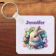 Eine Schlüsselkette mit einer adorable Abbildung. Ein braunes und weißes kleines Babybunny. Umgeben von hübschen Frühlingsblumen.