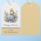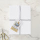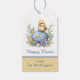 This cute Happy Easter gift tag features a cute yellow baby chick perched atop a decorated blue and yellow Easter egg. Spring flowers and ferns surround the egg, with Happy Easter printed in a script font below. Your name appears below in a print style font against a color block of yellow. The back of the tag is yellow, light enough if you want to add more text, either with the easy to use Zazzle tools before your finish your order or later with a pen. The tie is a soft gray color.