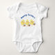 Dieser whimsical Baby Bodysuit ist mit drei bezaubernden, flauschigen, gelben Babykichen ausgestattet. Jedes Baby Küken hat einen braunen Osterkorb mit bunten Eiern und einem hellen orangefarbenen Bogen. Der gewölbte Text mit dem Aufdruck "Happy Oaster!" kann mit Ihrer eigenen Nachricht oder dem Namen eines Kindes personalisiert werden. Sie können auch die Farbe ändern.