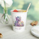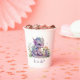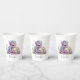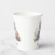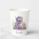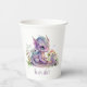 Fantasy Liebhaber Baby-Gender zeigen Papiertassen, mit süßer Grafik eines bunt blauen und rosa Babydrachen, mit bunten Wildblumen, vor einem weißen Hintergrund. Personalisieren Sie den benutzerdefinierten Text nach Ihren Bedürfnissen.