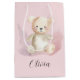 Niedliche Aquarellteddy Bärendekoration für Babydusche oder Geburtsankündigung. Sie können den Hintergrund für Blau leicht ändern, wenn Sie einen kleinen Jungen haben.