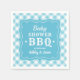 Lässige GRILLEN / Grill themed Baby Dusche Servietten, um einen kleinen Jungen willkommen zu heißen, mit einem himmelblauen Rahmen, Western und moderne Schriftart, Star-Akzente, und ein sonnenscheinend Baby Blue und Weiß Gingham Tischdecken karierte Grenze Design.