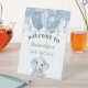 Unser Begrüßungsschild für die Babydusche ist die perfekte Möglichkeit, die Ankunft eines neuen Babys anzukündigen! Dekoriert mit blauen Ballons, Tropfen, tropfenden Farben, Glitzer, Party-Streamer und einem niedlichen Elefanten-Baby. Personalisieren und fügen Sie die Namen der Eltern. Weißer Hintergrund.