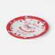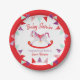 Hübsches handgemaltes lila und rotes Rockpferd mit Sternen und Grafikbügel rund um die Babydusche oder neue personalisierte Baby Paper Teller. Passen Sie sich mit Ihren eigenen Worten an und honorieren Sie den Namen/die Namen. Weitere passende Artikel sind verfügbar. Original whimsical Kinder Hobby Rocking Pferd Aquarellmalerei und bunting Grafik Design von Sarah Trett für www.mylittleeden.com auf Zazzle.