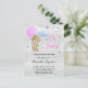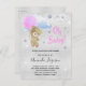 Für eine Babydusche, die ein Babymädchen feiert. Ein Imitat silber aussehender Hintergrund, mit Imitaten silber Glitzer Staub. Ein Teddybär, der einen rosa Ballon hält. Personalisieren und fügen Sie den Namen der Mutter zu sein und Party-Details. Der Name und der Text: Oh Baby! sind mit einem handgeschriebenen Stift geschrieben. Tipp: Wenn Sie es nicht so gewollt haben, dass es wie eine Postkarte aussieht, klicken Sie auf Anpassen, gehen Sie auf die Rückseite und entfernen Sie den Trenner und posten Sie die Briefmarke.