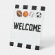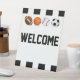Das ist ein Mini-Begrüßungsschild für die Babydusche. Es gibt ein sportliches Thema mit Schiedsstreifen. Fußball-Babydusche, Basketball-Babydusche, Fußball-Babydusche, Baseball-Babydusche