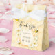 Eine Gefälligkeitsbox für eine Sommer-Baby-Dusche, geschlechtsneutral. Gelber Hintergrund mit Wabenmuster. Mit einem Imitat goldener geometrischer Rahmen. Die Blume sind mit hellgelben, cremefarbenen tropischen Blumen geschmückt, der Hibiskus und die glücklichen Hummeln. Mit dem Text: Vielen Dank und Mama zu Bee geschrieben mit einem modernen handgeschriebenen Stil Skript. Personalisieren und fügen Sie den Namen der Mutter, um den Namen der Biene und das Datum der Dusche. Schwarze Buchstaben.