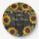 Rustikal blumengeschmückte Sonnenblume Baby duschen personalisierte Papierfresser Teller mit elegantem Schriftzeichen auf braunem Holzhintergrund mit Saitenleuchten.