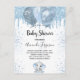 Für eine Babydusche, Feiern eines kleinen Jungen. Ein schick weißer Hintergrund. Dekoriert mit blauen Imitaten Glitzer Tropfen, Farbe Tropfen aussehen, Ballons und ein niedlicher kleiner Elefant Junge. Personalisieren und fügen Sie den Namen der Mutter zu sein Name und Party Details. Der Name und der Text: Baby Shower sind mit einem handgeschriebenen Stift geschrieben. Zurück: Postkartendesign. Tipp: Wenn Sie es nicht so gewollt haben, dass es wie eine Postkarte aussieht, klicken Sie auf Anpassen, gehen Sie auf die Rückseite und entfernen Sie den Trenner und posten Sie die Briefmarke.