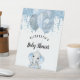 Unser Begrüßungsschild für die Babydusche ist die perfekte Möglichkeit, die Ankunft eines neuen Babys anzukündigen! Dekoriert mit blauen Ballons, Imitate Glitzer Tropfen, Farbe Tropfen Aussehen, Glitzer, Party Streamer, und ein niedlicher Elefant Baby. Personalisieren Sie sich mit der Mutter, um den Namen zu sein. Weißer Hintergrund.