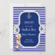 Ahoy. Kleine Sailor Baby Dusche. Niedlicher Junge mit Striphosen und Schuhen für Sneakers. Nautikblau-weiß gestreifter Rahmen und Ankerseil. Segeln Baby Dusche für Blonde Babys, leicht gehäufteter Baby Junge. Vintage Kinderdusche für einen Jungen. Sehr niedliche Babydusche.
