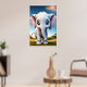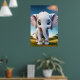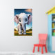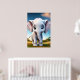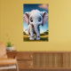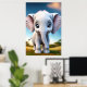 Poster eines niedlichen, animierten Babyelefanten mit großen, ausdrucksstarken Augen, stehend in einem grasbewachsenen Feld unter einem hellen Himmel. Der Elefant hat einen fröhlichen Ausdruck, der mit sanften, pastellfarbenen Farben geschmückt ist, die seine spielerische Natur verstärken.