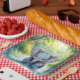 A sweet first birthday paper plate with an elephant theme. A cute baby elephant looking at his reflection in the water.