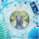 A sweet personalized first birthday paper plate with an elephant theme. A cute baby elephant looking at his reflection in the water.